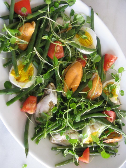 Watercress sprouts, new hard-boiled eggs, mussels, steamed haricots vertes (From Lum & Co) and some diced tomato. The dressing: local limes and local olive oil. Eating in the warm sunshine and sheltered from the southerly, I almost felt for a minute or two it was summer.
